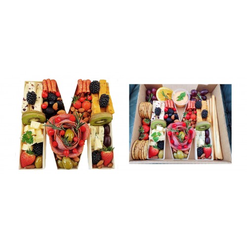 Filled with the finest charcuterie, cheeses, olives, nuts, peppers, fresh seasonal fruits, crackers, bread sticks, hummus.